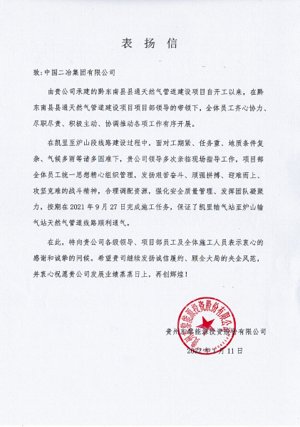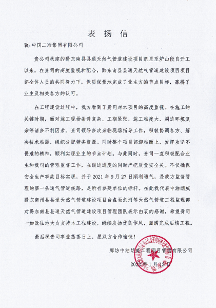 貴州東黎投資股份有限公司在表揚信中指出,在凱里至爐山段線路建設(shè)過程中,面對工期緊、任務(wù)重、地質(zhì)條件復(fù)雜、氣候多雨等諸多困難下,中國二冶領(lǐng)導(dǎo)多次親臨現(xiàn)場指導(dǎo)工作,項目部全體員工統(tǒng)一思想精細(xì)組織管理,合理調(diào)配資源,強化安全質(zhì)量管理、發(fā)揮團隊凝聚力,按照計劃節(jié)點日期完成施工任務(wù),保證了凱里輸氣站至爐山輸氣站天然氣管道線路順利通氣,在此向中國二冶表示衷心的感謝和誠摯的問候。同時,希望中國二冶繼續(xù)發(fā)揚誠信履約、顧全大局的央企風(fēng)范,與我方實現(xiàn)合作共贏,圓滿完成施工任務(wù)。