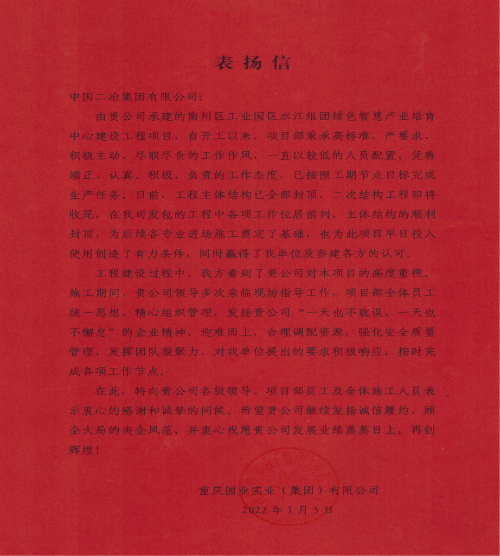 重慶園業(yè)實業(yè)(集團)有限公司在表揚信中指出,中國二冶南川區(qū)工業(yè)園區(qū)水江組團綠色智慧產(chǎn)業(yè)培育中心建設(shè)工程項目自開工以來,項目經(jīng)理部秉承高標(biāo)準(zhǔn)、嚴(yán)要求、積極主動、盡職盡責(zé)的工作作風(fēng),如期完成建設(shè)方下達的工程進度目標(biāo),在其公司發(fā)包的眾多工程中各項工作位居前列。希望項目部能夠在接下來的施工建設(shè)工作中繼續(xù)協(xié)調(diào)各方、持續(xù)發(fā)力,推進項目早日建成并投入使用,同時祝愿中國二冶集團有限公司發(fā)展業(yè)績蒸蒸日上,再創(chuàng)輝煌。