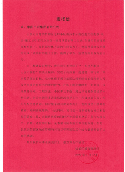 邢臺市信都區(qū)城市管理局在表揚信中指出,中國二冶在工程建設(shè)過程中完美詮釋了“一天也不耽誤、一天也不懈怠”的企業(yè)精神,充分體現(xiàn)了項目部高效的管理能力和高水平的施工履約能力。在施工關(guān)鍵時期,面對施工現(xiàn)場條件困難、工期緊張、小區(qū)多且零散、周邊環(huán)境復雜等諸多不利因素,項目部積極組織協(xié)調(diào),合理分配資源,全體人員聚力同心、攻堅克難,提前完成項目履約,在本項目中為其他施工單位樹立了標桿和榜樣。