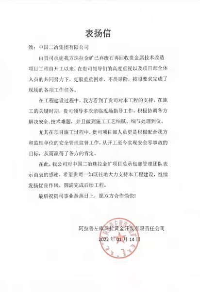 阿拉善左旗珠拉黃金開發(fā)有限責任公司在表揚信中指出,在工程施工的關(guān)鍵時期,面對施工現(xiàn)場條件復雜、工期緊張、施工難度大、周邊環(huán)境復雜等諸多不利因素,整個項目部人員都迎難而上、發(fā)揮攻堅不畏難的精神,全力做到施工工藝細膩、細節(jié)處理到位。同時,中國二冶積極配合業(yè)主及監(jiān)理單位做好管理監(jiān)督工作,在跟進進度的同時嚴把質(zhì)量安全關(guān),從開工至今實現(xiàn)了零事故的目標,贏得了各方的肯定,在此向中國二冶表示衷心的感謝和誠摯的問候。同時,希望中國二冶一如既往地大力支持本工程建設(shè),繼續(xù)發(fā)揚優(yōu)良作風,圓滿完成后續(xù)工程。