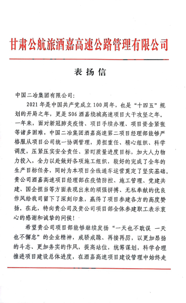 1月17日,甘肅公航旅酒嘉高速公路管理有限公司致中國二冶酒嘉高速公路項目部表揚信,對酒嘉項目在2021年疫情防控、施工管理、黨建共建、國企擔當?shù)确矫姹憩F(xiàn)出來的頑強拼搏、無私奉獻的優(yōu)良作風表示高度贊揚。