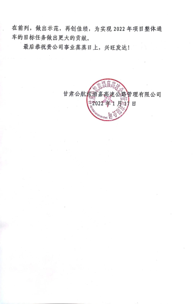 信中指出,2021年是中國共產(chǎn)黨成立100周年,也是“十四五”規(guī)劃的開局之年。一年來,面對新冠肺炎疫情、項目手續(xù)辦理、項目資金緊張等諸多困難,中國二冶集團酒嘉高速項目經(jīng)理部能夠嚴格服從項目公司統(tǒng)一協(xié)調管理,勇?lián)厝巍⒕慕M織、科學調度,壓緊壓實安全責任、緊盯質量進度目標,加大人力物力投入,全力以赴做好各項施工組織,較好的完成了全年的生產(chǎn)目標任務,同時為本項目全線通車運營奠定了堅實基礎。酒嘉高速項目經(jīng)理部在疫情防控、施工管理、黨建共建、國企擔當?shù)确矫姹憩F(xiàn)出來的頑強拼搏、無私奉獻的優(yōu)良作風給我司留下了深刻印象,贏得了項目參建各方的高度贊揚。在此,特向貴公司及貴公司項目部全體參建職工表示衷心的感謝和誠摯的問候。