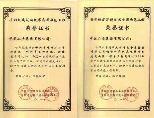 3月28日,中國二冶承建的五礦有色銅鉛鋅產業(yè)基地鋅項目建筑安裝工程第三標段項目和邯鄲市峰峰礦區(qū)中心醫(yī)院(邯鄲市第四醫(yī)院)擴建項目工程榮獲2021年度中國冶金科工集團有限公司、中國冶金科工股份有限公司建筑新技術應用示范工程。
