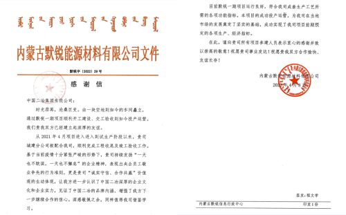 4月8日和12日,中國(guó)二冶連續(xù)收到內(nèi)蒙古默銳能源材料有限公司的兩封感謝信,盛贊中國(guó)二冶在默銳一期項(xiàng)目建設(shè)中,突破工期緊任務(wù)重等不利因素,高標(biāo)準(zhǔn)嚴(yán)要求,精益求精匠心智造,披荊斬棘打造樣板工程,優(yōu)質(zhì)快速完成工程建設(shè)任務(wù),充分彰顯冶金建設(shè)國(guó)家隊(duì)的央企責(zé)任和擔(dān)當(dāng)。