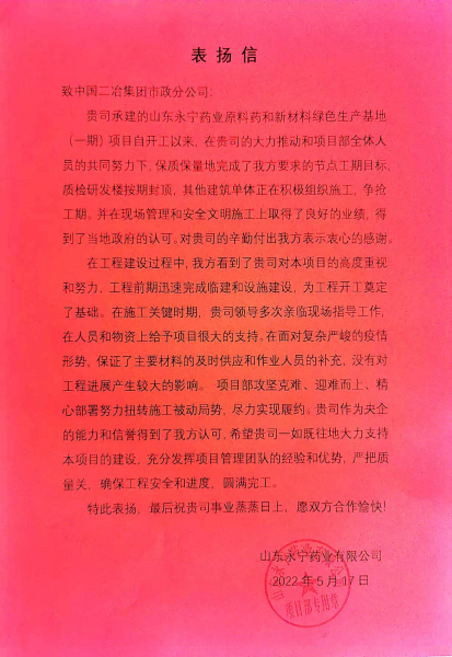 5月17日,中國(guó)二冶收到山東永寧藥業(yè)有限公司發(fā)來的感謝信,信中贊揚(yáng)中國(guó)二冶在山東永寧藥業(yè)項(xiàng)目建設(shè)過程中,實(shí)干擔(dān)當(dāng)、迎難而上、精心部署,努力克服工期緊、任務(wù)重等不利因素,在復(fù)雜嚴(yán)峻的疫情形勢(shì)下,保證材料供應(yīng)和人員補(bǔ)充,嚴(yán)把質(zhì)量關(guān),打造精品工程,充分展現(xiàn)出央企的責(zé)任與擔(dān)當(dāng)。