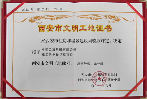 7月5日,中國(guó)二冶收到西安市住房和城鄉(xiāng)建設(shè)局頒發(fā)的榮譽(yù)證書(shū)及獎(jiǎng)牌,由中國(guó)二冶承建的中譽(yù)華庭項(xiàng)目榮獲西安市“文明工地”榮譽(yù)稱號(hào)。