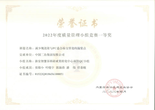 近年來,中國二冶始終長期堅持走高技術(shù)高質(zhì)量創(chuàng)新發(fā)展之路,自上而下成立質(zhì)量管理QC小組,加大科技創(chuàng)新力度,不斷鼓勵科研人員廣泛開展群眾性QC成果活動,加強(qiáng)工程實(shí)體質(zhì)量,打造精品工程,取得了突出成績。其中,中國二冶城建分公司淮安智慧谷科研成果轉(zhuǎn)化中心項(xiàng)目QC小組編寫的《減少現(xiàn)澆梁與PC疊合板交界處的漏漿點(diǎn)》、鋼結(jié)構(gòu)分公司QC小組編寫的《提高箱型柱對接焊縫一次焊接合格率》兩項(xiàng)QC成果榮獲內(nèi)蒙古自治區(qū)2022年度質(zhì)量管理小組競賽一等獎。