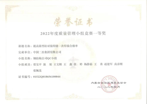 近日,中國二冶從內(nèi)蒙古自治區(qū)建筑業(yè)協(xié)會捧回獲獎證書,十八個項(xiàng)目斬獲內(nèi)蒙古自治區(qū)2022年度質(zhì)量管理小組競賽一、二、三等獎。