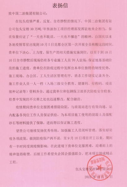10月31日,中國(guó)二冶包頭寶楷30萬噸/年焦油加工項(xiàng)目部收到包頭寶楷炭材料有限公司表揚(yáng)信,對(duì)該項(xiàng)目在施工過程中積極籌備各項(xiàng)工作,特別是在此次包頭疫情形勢(shì)嚴(yán)峻的情況下,下大決心,上狠力度,保施工進(jìn)度的行為給予表揚(yáng)。