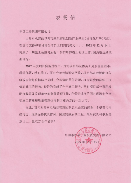 12月18日,中國(guó)二冶華東分公司承建的阜陽(yáng)市潁泉智能創(chuàng)新產(chǎn)業(yè)基地(標(biāo)準(zhǔn)化廠房)項(xiàng)目部收到業(yè)主方阜陽(yáng)市穎泉工業(yè)投資發(fā)展有限公司的表?yè)P(yáng)信,對(duì)華東分公司阜陽(yáng)項(xiàng)目部在阜陽(yáng)市潁泉智能創(chuàng)新產(chǎn)業(yè)基地(標(biāo)準(zhǔn)化廠房)工程建設(shè)過程中,勇于面對(duì)各種困難、精心策劃、科學(xué)管理、全力以赴的工作態(tài)度表示贊許。