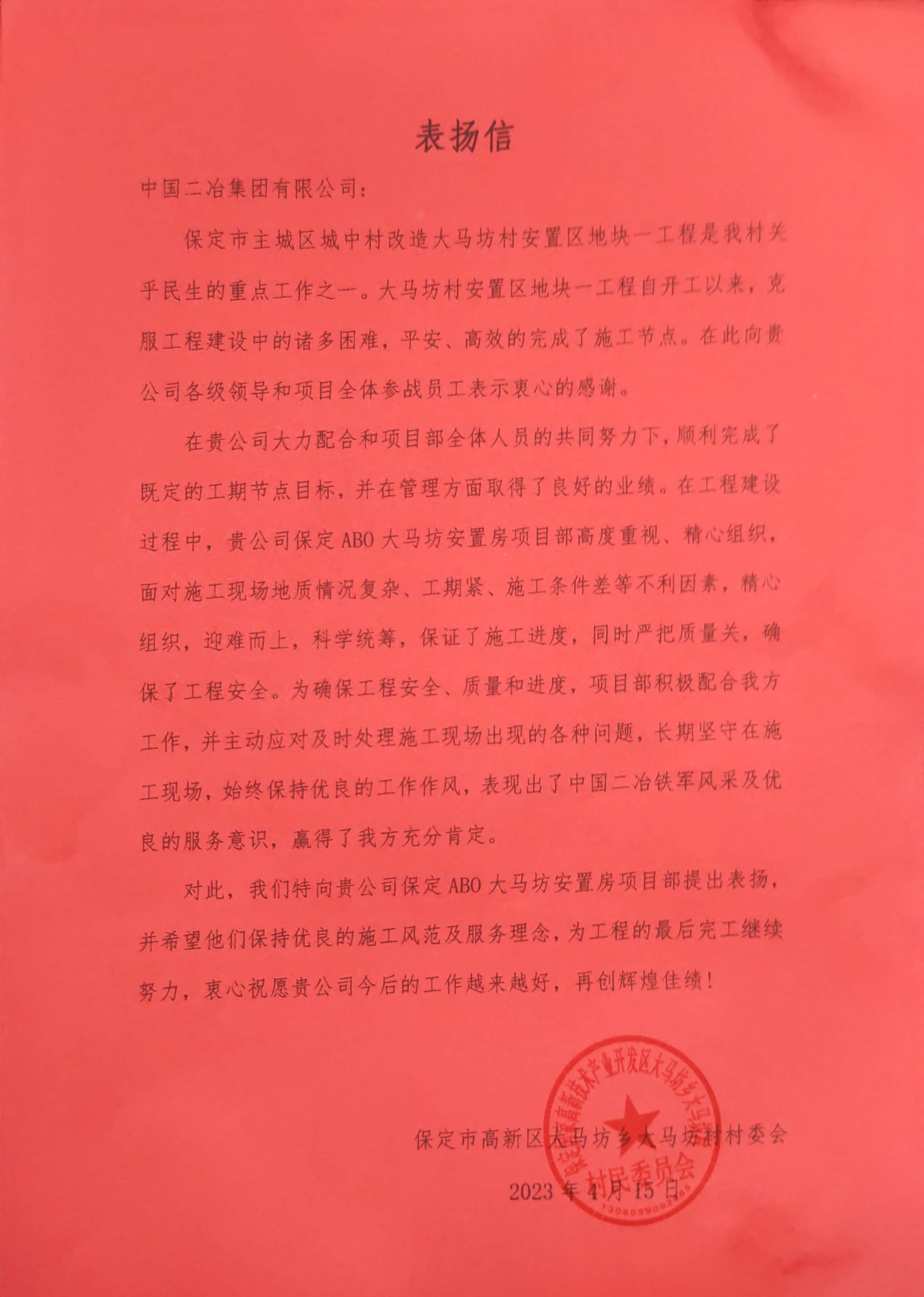 近日,中國二冶房地產(chǎn)公司承建的保定ABO二期大馬坊項(xiàng)目部分別收到來自大馬坊村委會(huì)及大馬坊鄉(xiāng)政府的兩封表揚(yáng)信。