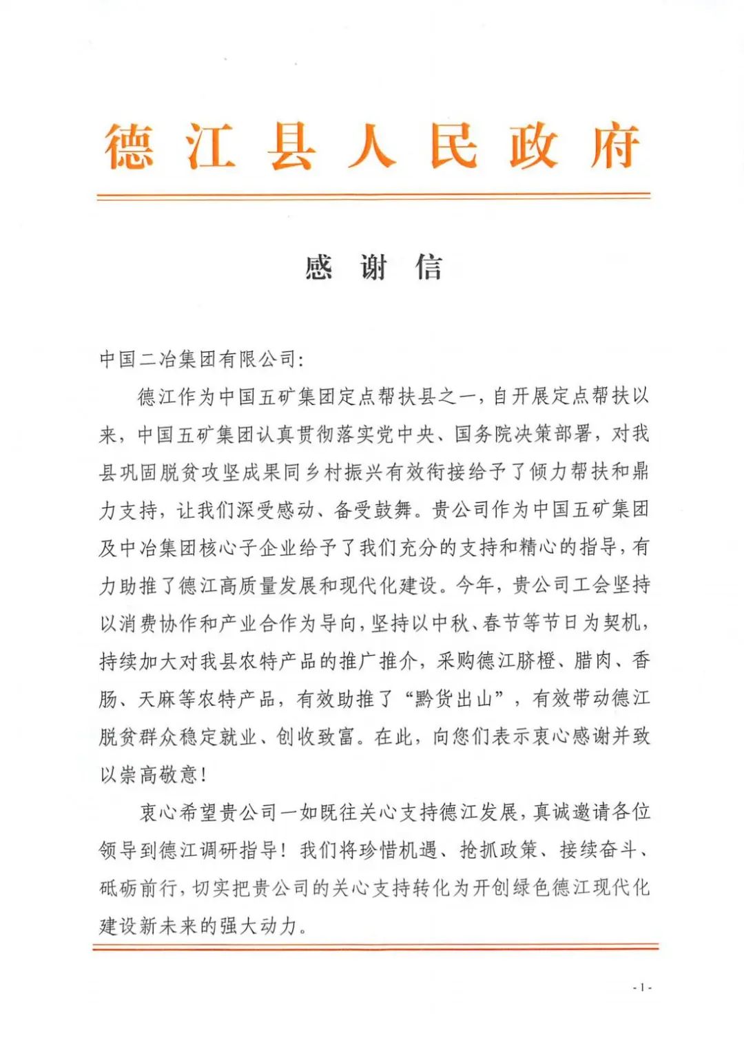 1月20日,中國二冶收到貴州省銅仁市德江縣人民政府感謝信,對中國二冶在助推“黔貨出山”,帶動德江脫貧群眾穩(wěn)定就業(yè)、創(chuàng)收致富方面作出的貢獻表示感謝。